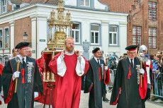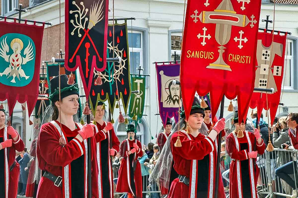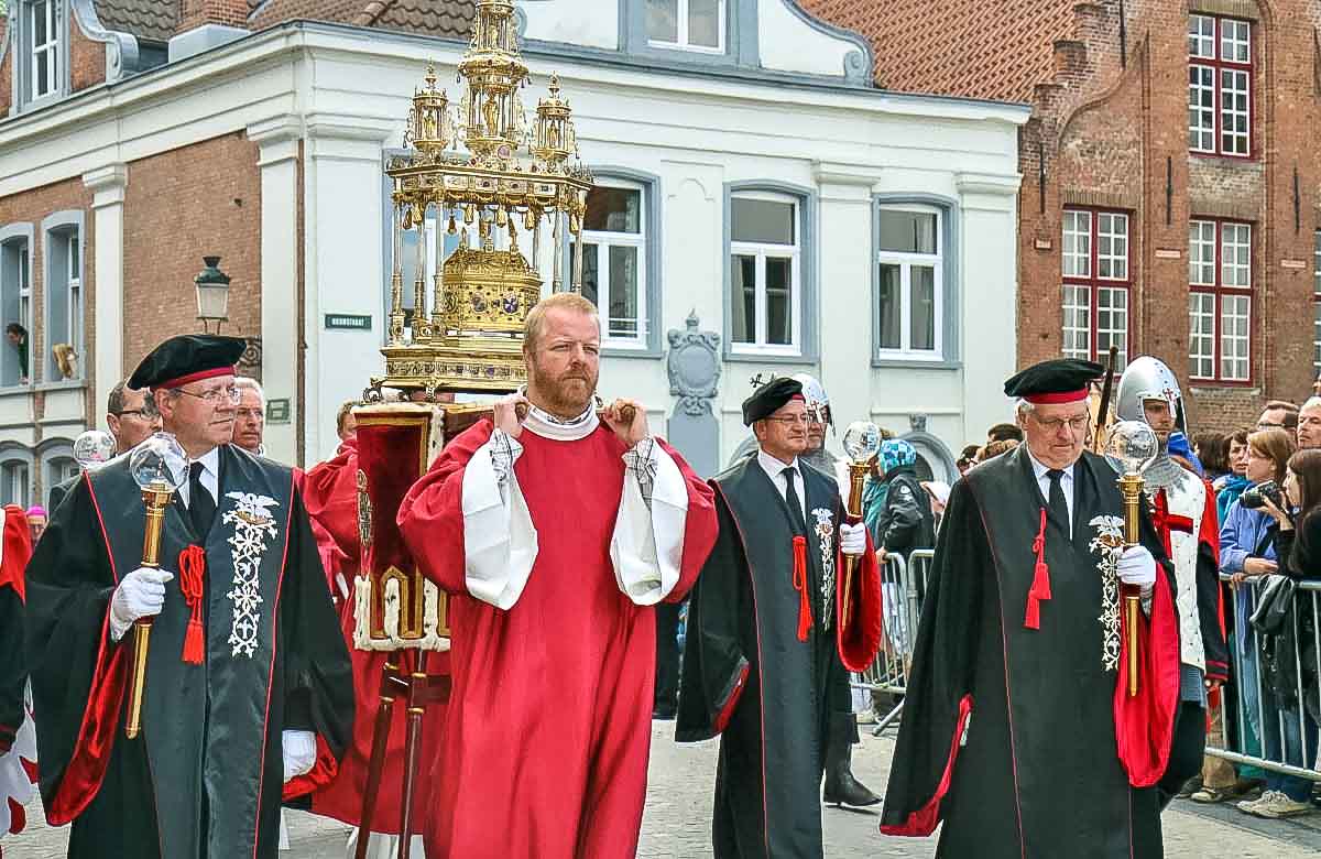 The bishop of Bruges carries the relic through the streets, accompanied by costumed residents acting out biblical scenes.The tradition of the procession is first recorded in 1291. It followed a route around the city walls until 1578, when the religious wars necessitated its relocation to the city center. It is this route that is still followed today.