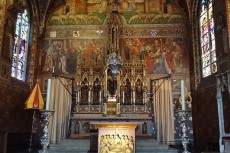 The upper chapel was originally Romanesque as well, but is now Gothic with mostly modern decoration. It is lit by stained glass windows and covered with murals, including a brightly painted altar backdrop depicting the Trinity and scenes relating to the Holy Blood relic.The Holy Blood relic is embedded in a rock-crystal vial, which is placed inside a small glass cylinder capped with a golden crown at each end. The relic is kept in a magnificent silver tabernacle with a sculpture of the Lamb of God in the large side chapel of the upper church. More reliquaries can be seen in the Basilica Museum.