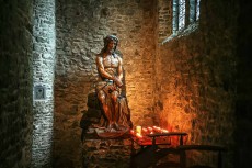 The lower chapel, the Chapel of St Basil, is the only Romanesque church in West Flanders, dating from the first half of the 12th century. It was built by Derrick, Count of Alsace (1128-1168) and dedicated to St Basil the Great to house a relic of the Greek theologian (d.379) brought back from Caesarea during the Crusades. The chapel has a short nave, tiny side aisles, a choir and apse. The doorway connecting the right aisle with the nave has a small sculpted tympanum (12th century) depicting the baptism of St. Basil. The right aisle also contains a polychrome statue (c.1306) of the Madonna and Child, displayed behind glass.