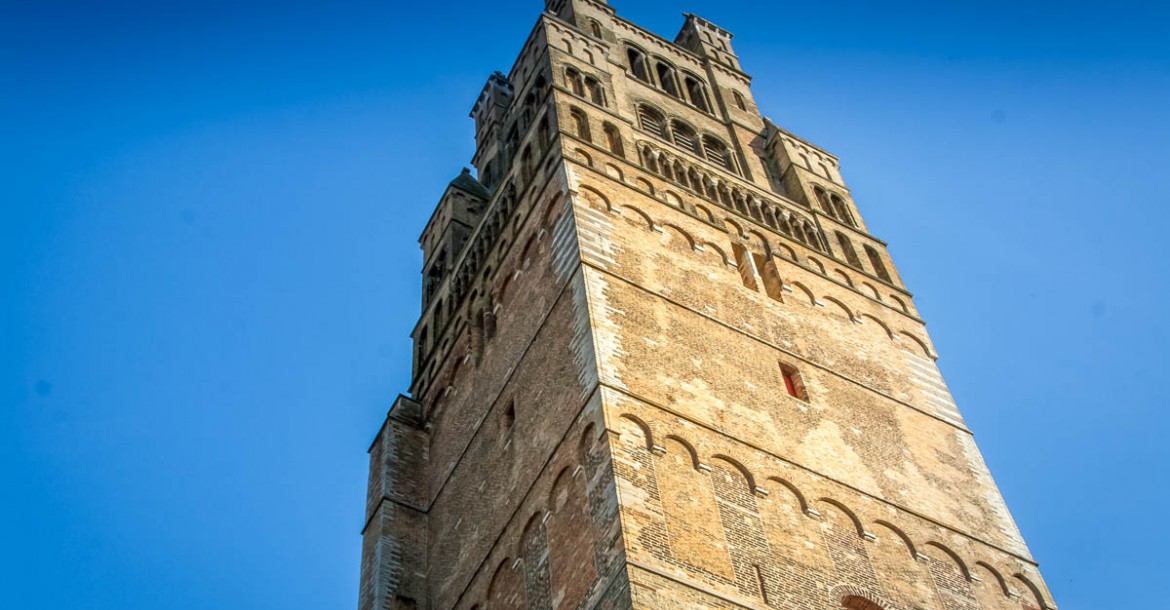 The roof of the cathedral collapsed in a fire in 1839. Robert Chantrell, an English architect, famous for his neo-Gothic restorations of English churches, was asked to restore to Sint-Salvator its former glory. At the same time he was authorized to make a project for a higher tower, in order to make it taller than that of the Onze-Lieve-Vrouwekerk. The oldest surviving part, dated from the 12th century, formed the base of the mighty tower. Instead of adding a neo-Gothic part to the tower, Chantrell chose a very personal Romanesque design. After completion there was a lot of criticism and the royal commission for monuments (Koninklijke Commissie voor Monumenten), without authorization by Chantrell, had placed a small peak on top of the tower, because the original design was deemed too flat. The Neo-Romanesque west tower is fortress-like 99 meters high.