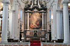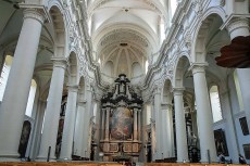 This is must-see for visitors to Bruges. St. Walburga's is a symphony of black and white marble. This Jesuit church was built by Pieter Huyssens in the middle of the 17th century and was originally dedicated to St. Francis Xavier . The image of this holy still adorns the austere facade. The white marble communion rails were made by Hendrik Frans Verbrugghen in 1695. These rails are a high point of Flemish Baroque sculpture. The confessionals in classicizing style date from 1802. The oak choir stalls and communion rails are from the 18th century. The organ case was commenced in 1735 by Frenchman Cornil Cacheux and completed by Jean Baptiste Fremat in 1739. It is decorated with statues of graceful women and Jesus on the Globe.