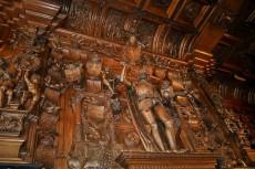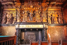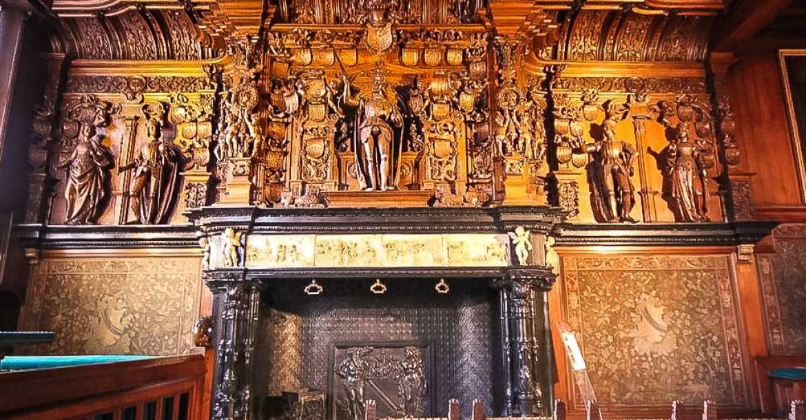 The alderman’s hall reflects royal power and justice. The Liberty's council chamber, which has been restored to its original 16th-century condition. The hall has a superb black marble fireplace decorated with an alabaster frieze and topped by an oak chimneypiece carved with statues of Emperor Charles V and his grandparents: Emperor Maximilian of Austria, Duchess Mary of Burgundy, King Ferdinand II of Aragon, and Queen Isabella I of Castile. Dating from 1528 and designed by Lanceloot Blondeel, the fireplace of oak, marble, and alabaster is one of the most important works of Renaissance art in Bruges.