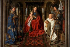 Culminating in a sublime painting by Jan van Eyck , 'The Madonna with Canon Van der Paele " enormous detail , beautiful colors ( even now ) . A painting where you can watch hours and then you have not seen all the details.