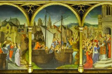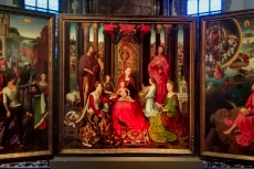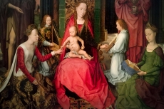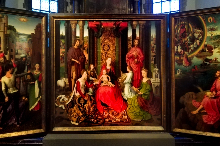 The other masterpiece is the 'Altarpiece of Saint-John the Baptist and Saint-John the Evangelist', made in 1479 and painted for the main altar in the church of the hospital. In the central panel is the Holy Virgin holding the child Jesus. Jesus puts a ring around the finger of Saint Catherine of Sienna. The woman sitting on the right of the Holy Virgin is Saint Catherine of Alexandria. The left side panel shows the story of Saint John the Baptist who was decapitated by order of Salome. The right side-panel illustrates the Apocalypse as told by Saint-John the Evangelist.