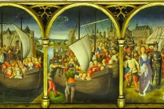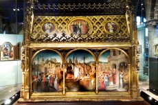 One of the masterpieces is the Shrine of St. Ursula. This wooden shrine contains the relics of St. Ursula. In six bow-arched panels, Memling tells the history of Ursula. The two front panels show St.Ursula accompanied by 10 virgins, each representing 1.000 virgins (see picture below) , and Our Blessed Lady in the presence of two hospital sisters.