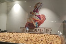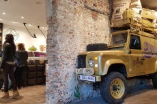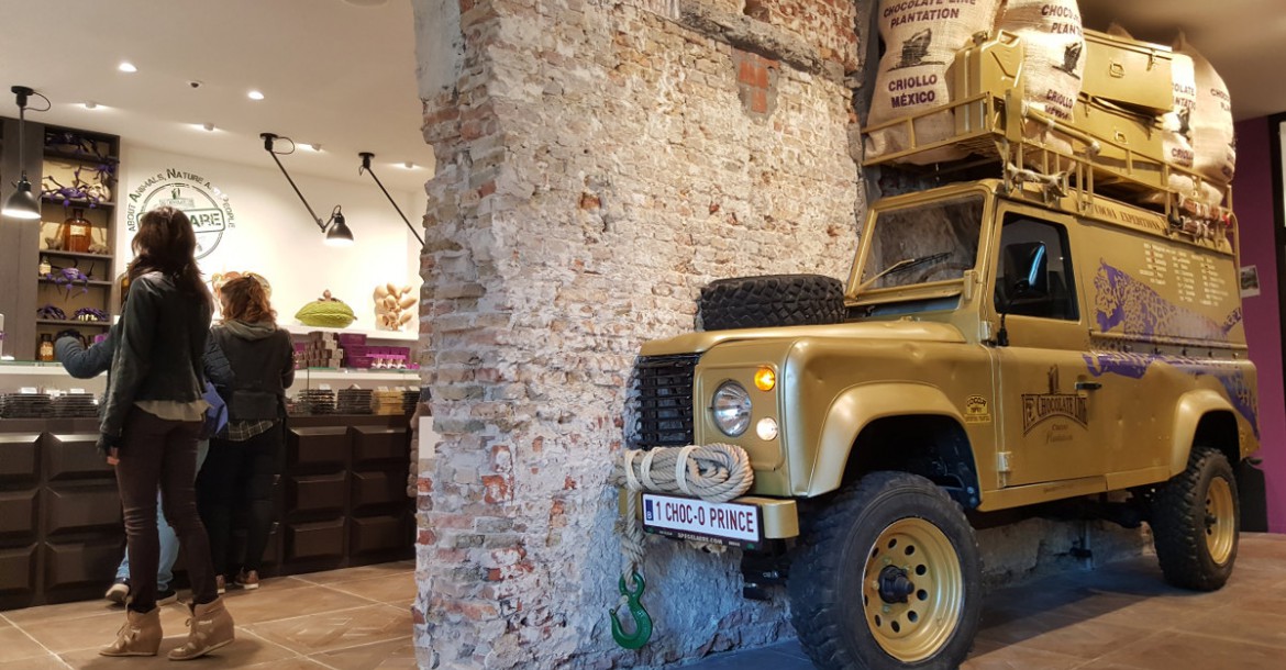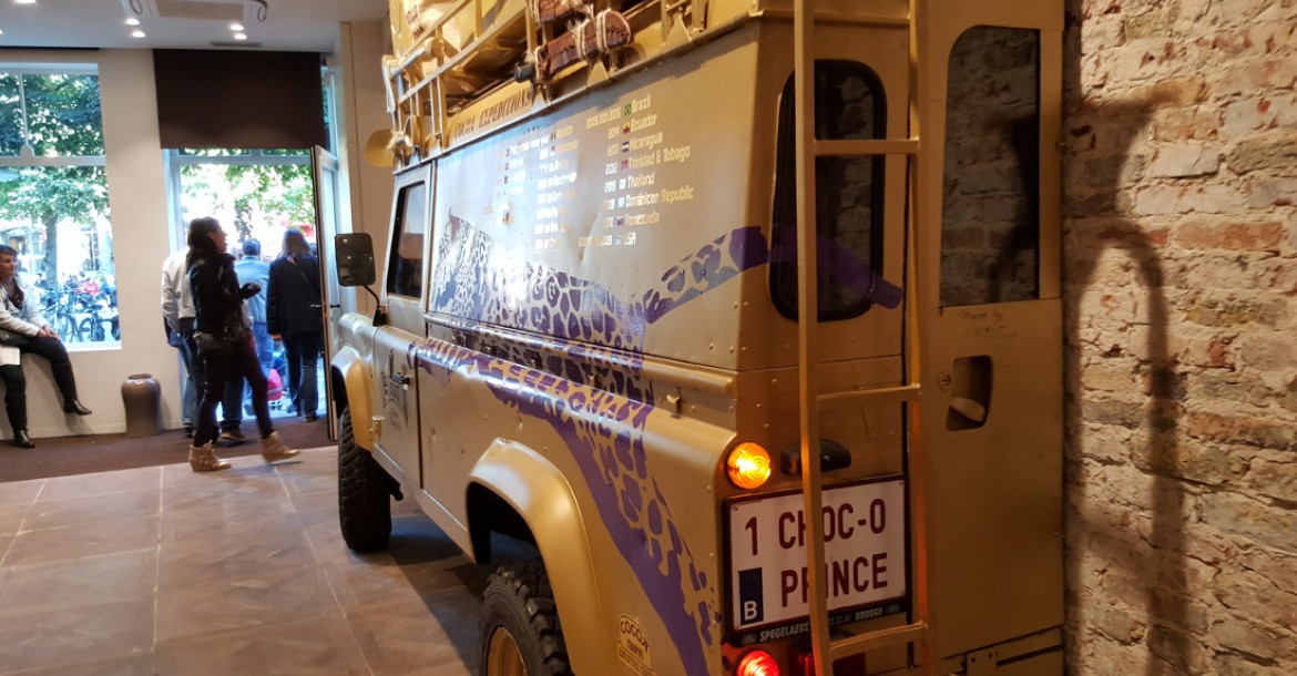 A chocolate expedition safari jeep built against the wall is clearly an eyecatcher. The refurbished shop follows the process from cocoa bean to chocolate, by a large see-through wall.