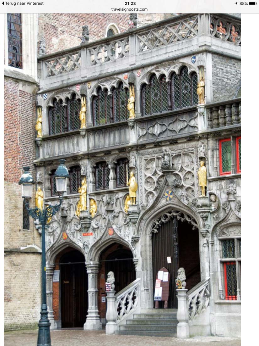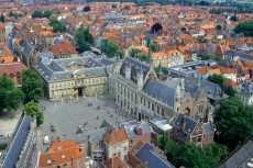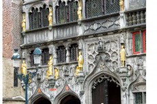 Next-door to The Stadhuis is the smaller Renaissance period Old Civil Registry (1537). This was once the Old Court House. Although smaller than its neighbor, it rivals it for beauty, color and style if not size.The Palace of the Liberty of Bruges was the place from which the surrounding countryside (Brugse Vrije) was governed from the late Middle Ages until 1795 – the “Liberty” was the name of a district of Bruges. This palace later served as the Old Court House for nearly 200 years. Atop the building's large, central dormer stands a bronzed statue of the blindfolded Lady Justice and on either side of Justice, on a pair of smaller dormers, are statues of Moses and Aaron, also in bronze.